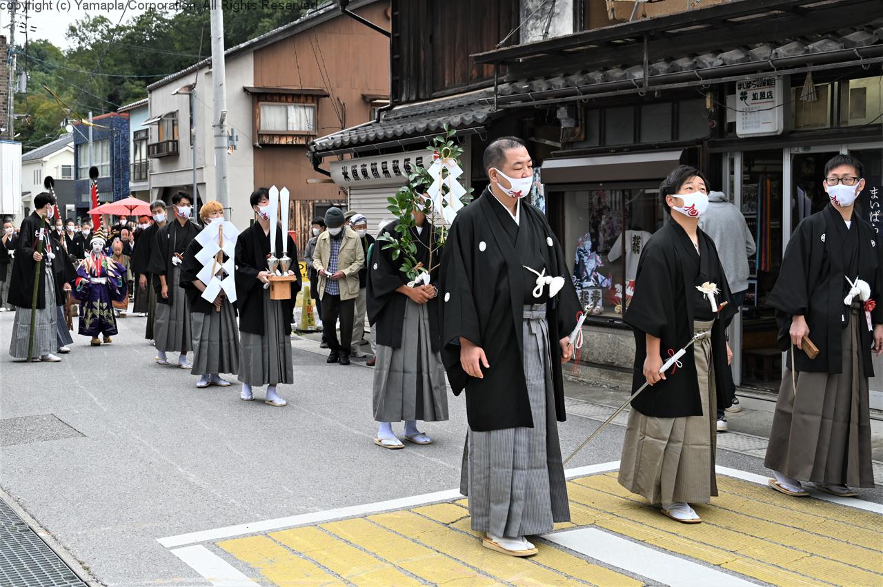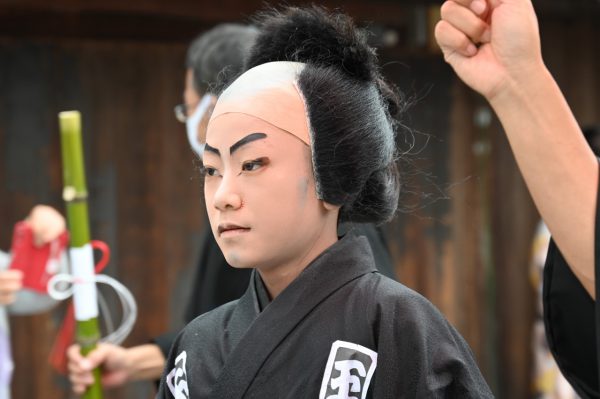 9日の本樂では、北町の旭山、南町の寿山、中町の松翁山の3組が、それぞれの詰所から湯谷神社まで練り歩く「御渡り」を行った後、旭山組から順番に子ども歌舞伎を奉納した。