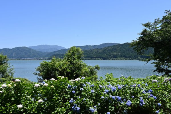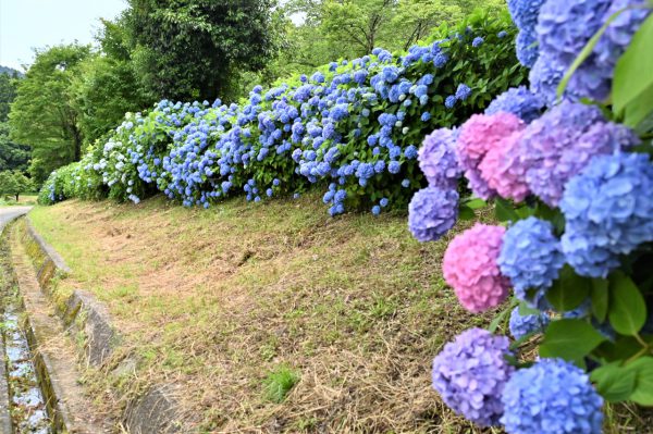 余呉湖(長浜市余呉町)の余呉湖あじさい園で、約1万株のアジサイが見頃を迎えている。 30年ほど前から地元の住民らによって大事に育てられ、青やピンクの色鮮やかな花が湖畔の道路沿い600メートルを彩っている。