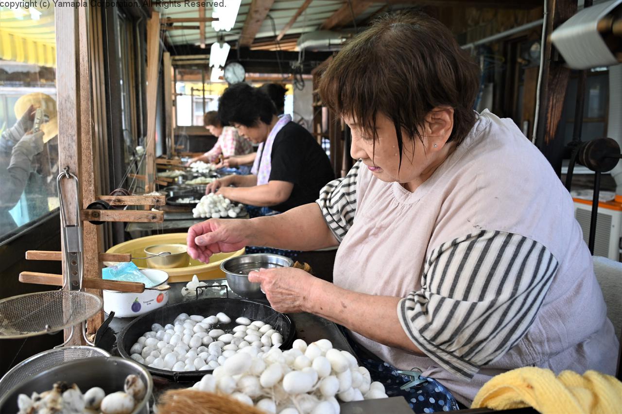 長浜市木之本町大音(おおと)の「佃平七糸取り工房」で、三味線や琴などの和楽器に使われる糸を作る「糸取り」が行われている。約75度の熱湯の中に20個ほどの繭玉を入れ糸口をたぐり寄せた後、「だるま」と呼ばれる木製の道具に巻き取られる。 作業は7月下旬ころまで続く。
