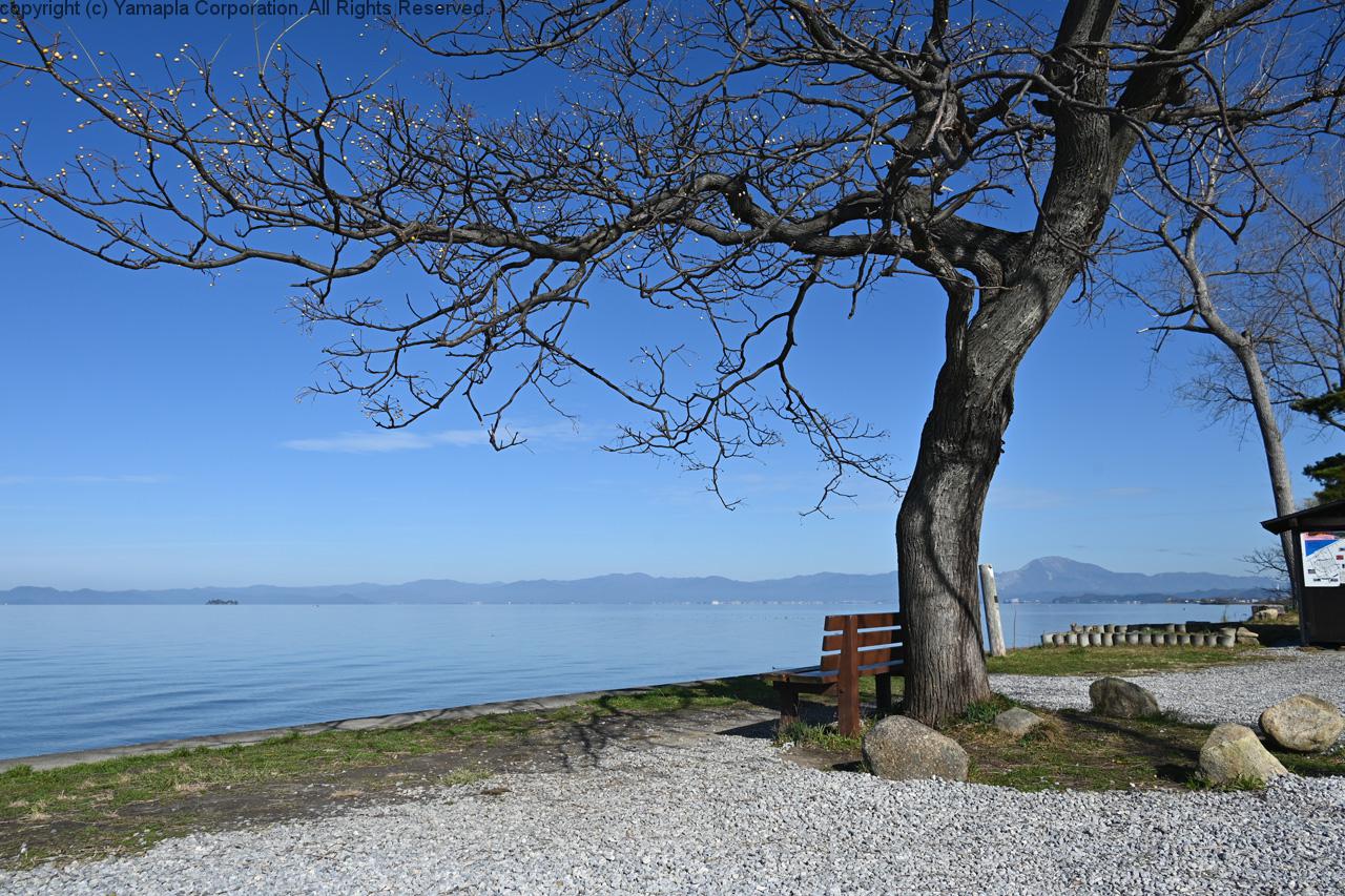 彦根市石寺町の湖岸沿いにある大きな一本のセンダンの木の下に設置されており、ベンチに座ると雄大な琵琶湖と青い空が目の前に広がる。晴れた日には対岸の比良山系や伊吹山、沖島などが一望でき、葉を落としたセンダンが冬の風景を一層際立たせている。