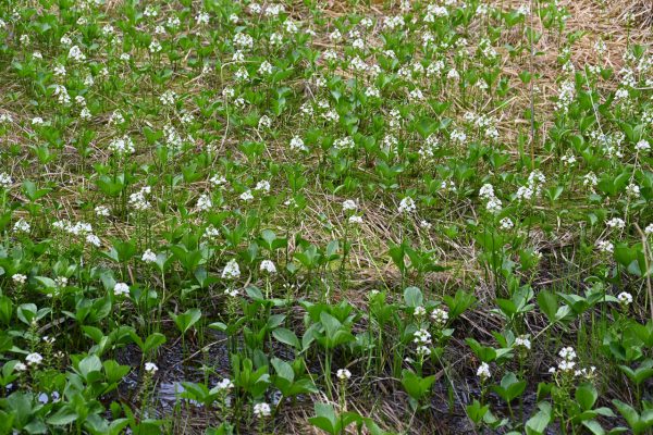 約4万年前に誕生していたといわれる山門湿原にはミツガシワをはじめ希少植物11種が確認されており、四季を通してハイカーや植物愛好家らを楽しませている。(撮影日 4月26日)