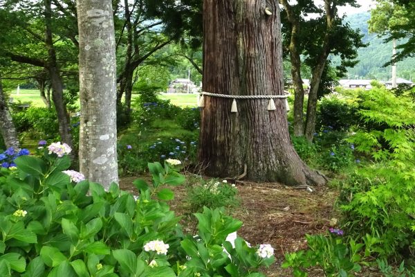 約1500株の色とりどりの花が、推定樹齢500年の大杉と一緒に迎えてくれる。