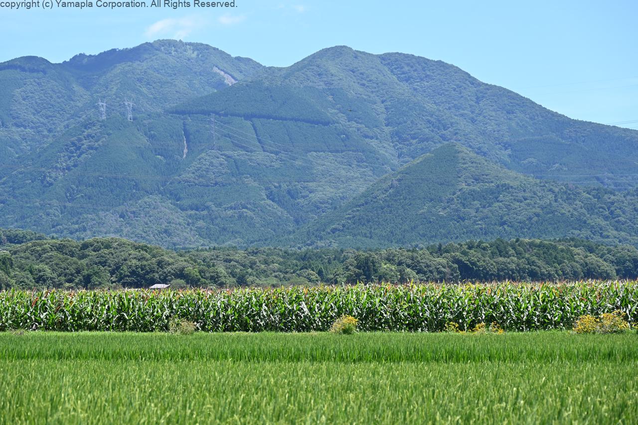 夏の味覚トウモロコシが、蒲生郡日野町西大路を走る国道477号線沿いに植えられている。 古くから山岳信仰の山として親しまれてきた綿向山(標高1,110メートル)を背景に、暑い日差しを浴びながら一面に広がるトウモロコシ畑。