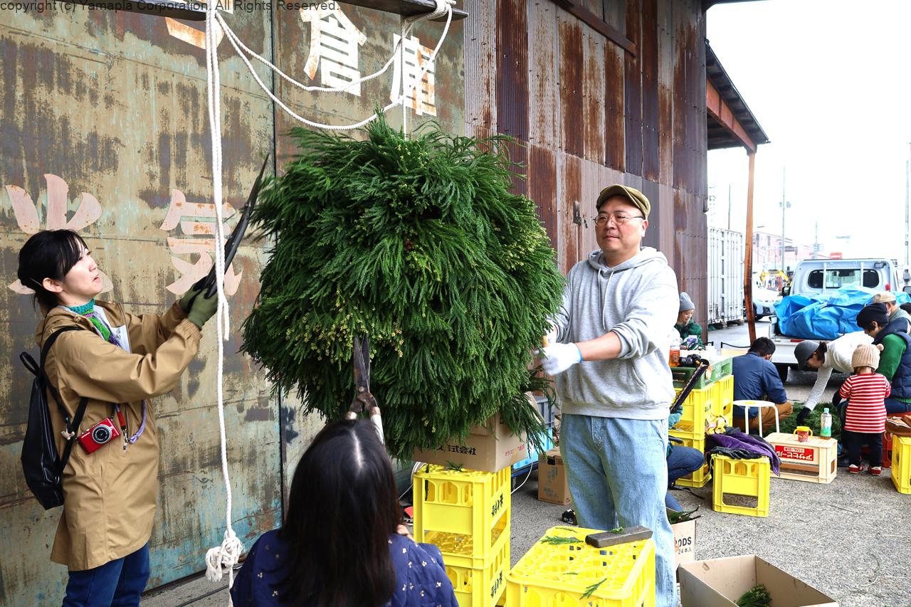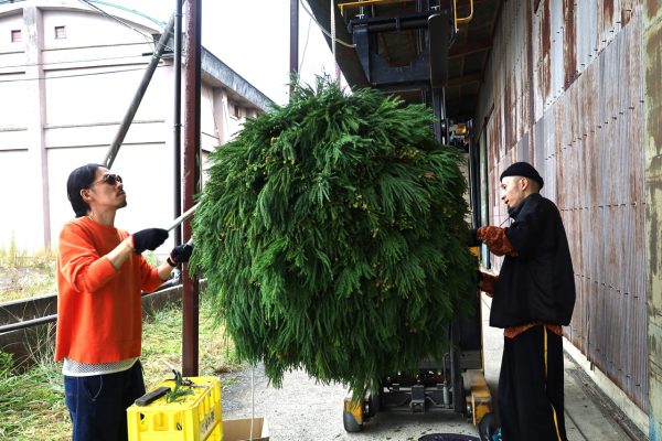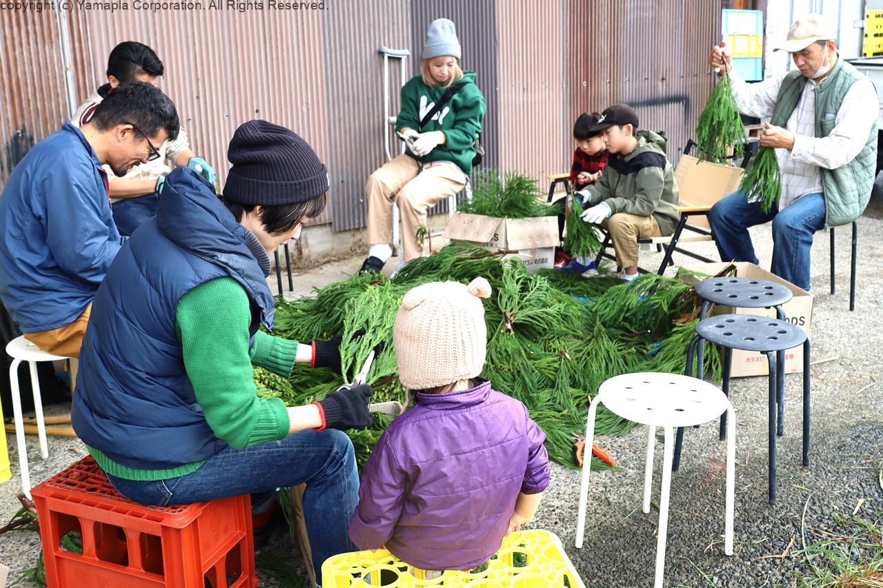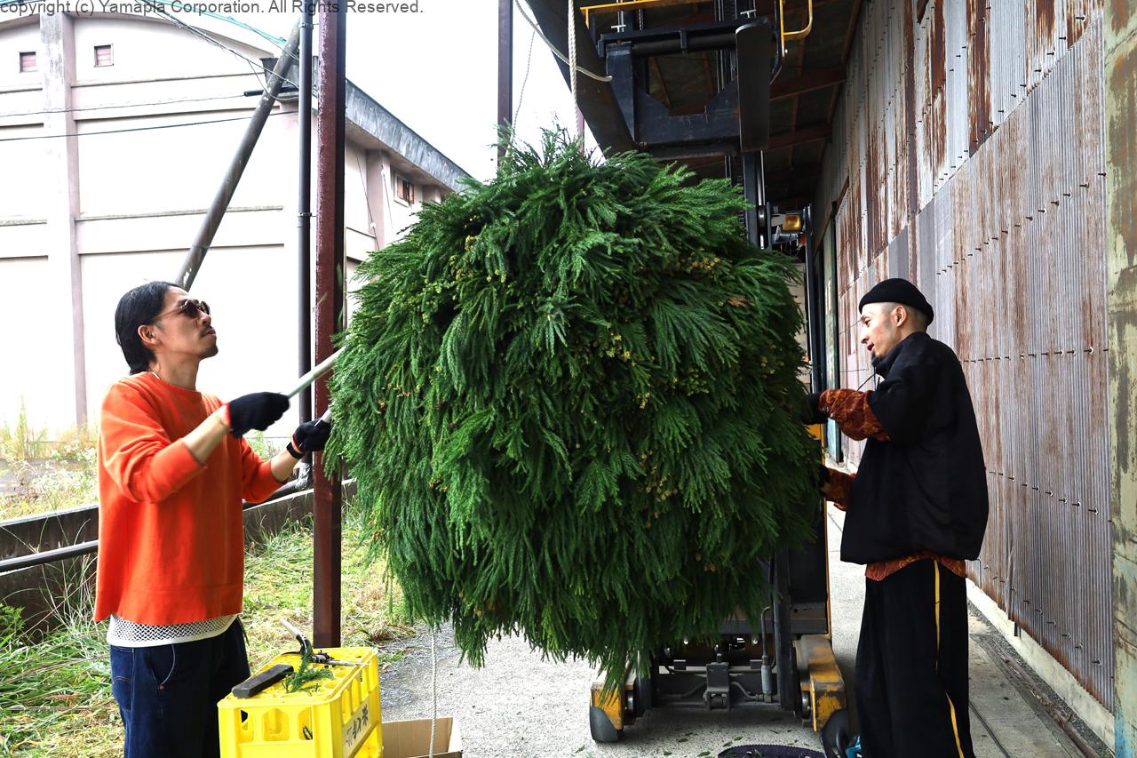 杉玉は、蔵元の従業員や米農家など繋がりのある近所の住人など20数名が集まり、伐採した杉の枝を切ったり芯になる金網に差し込んだりしながら完成させた。