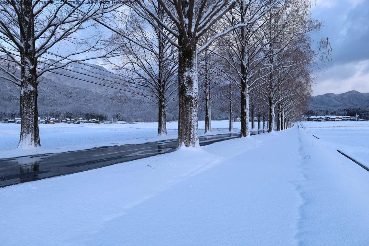 冬型の気圧配置が強まった2月5日、県北部を中心に雪が降った。 高島市マキノ町の観光名所、メタセコイア並木には雪化粧した姿を見ようと早朝から多くの観光客でにぎわった。