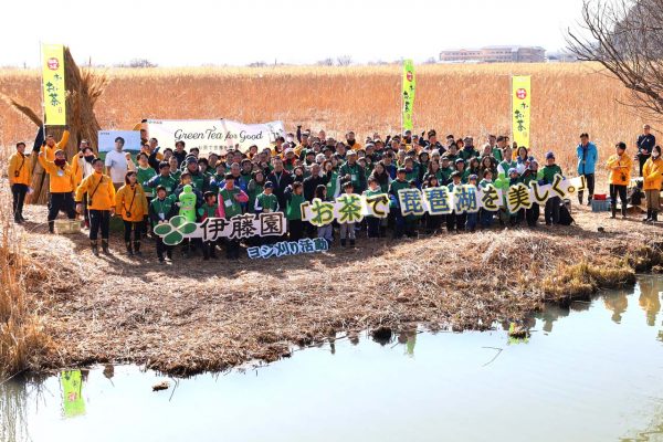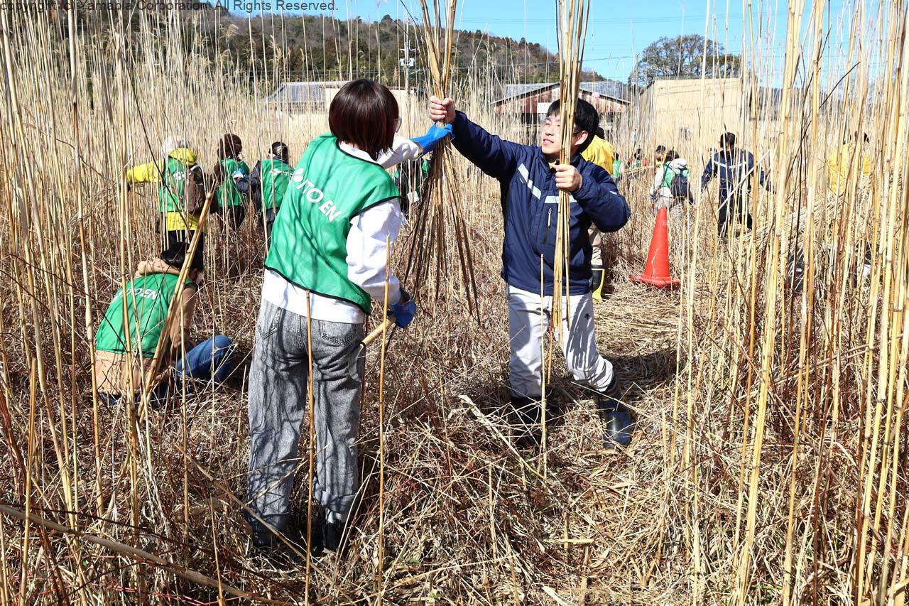 近江八幡市円山町の西の湖で2月15日、大手飲料メーカー伊藤園が主催する「ヨシ刈り体験」が開催された。