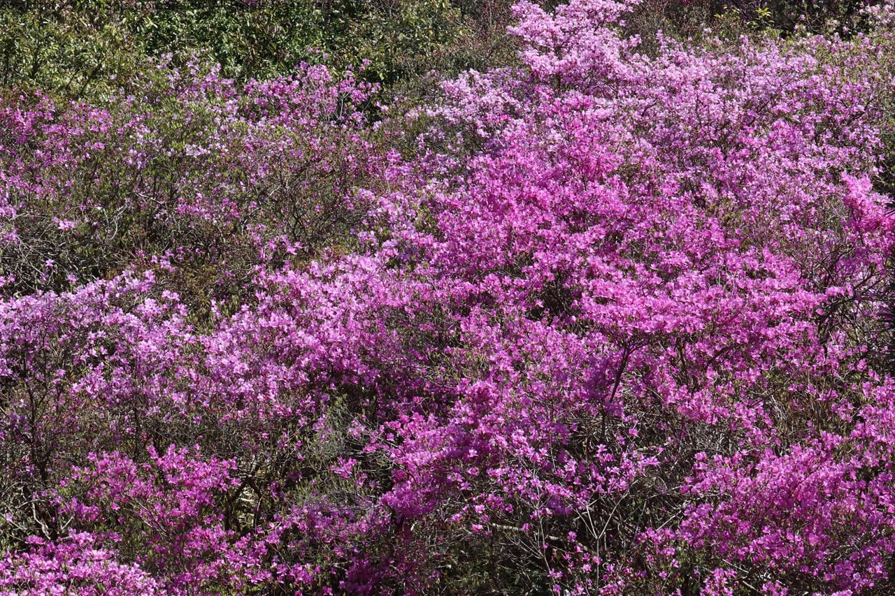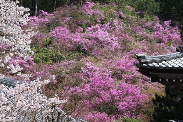 米原市番場にある蓮華寺裏手の山で、自生するミツバツツジが満開を迎えている。 ミツバツツジは3枚のひし形の葉が根元で1つになっていることから名づけられたといい、紅紫色の花を咲かせる。 見ごろを迎えた境内の桜とミツバツツジのピンクの競演が目を楽しませてくれる。