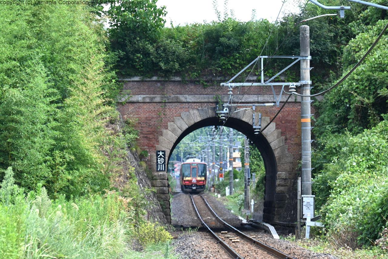 大沙川は天井川のため、1884(明治17)年3月大砂川を潜る県下初の隧道が造られた。日本で現存する最古の石積み道路トンネルで、1889(明治22)年には隣接するJR草津線に「大砂川トンネル」が完成した。