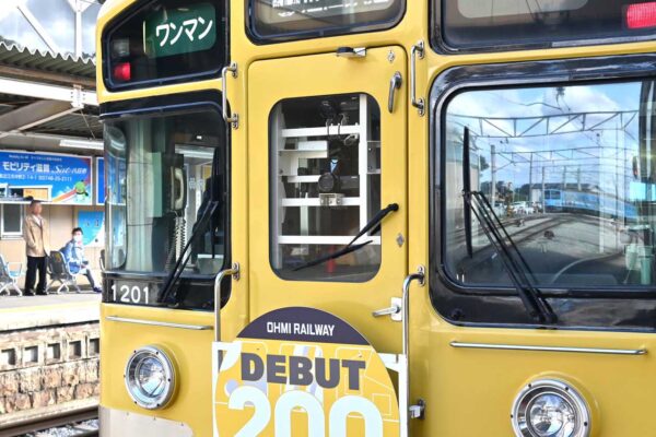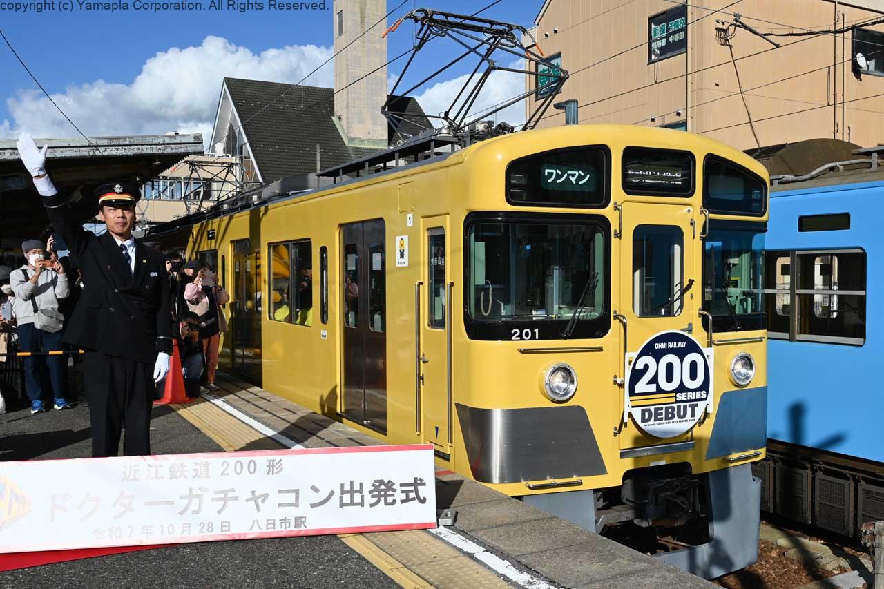近江鉄道の新車両200形「ドクターガチャコン」の出発式が10月28日、東近江市の八日市駅で行われた。