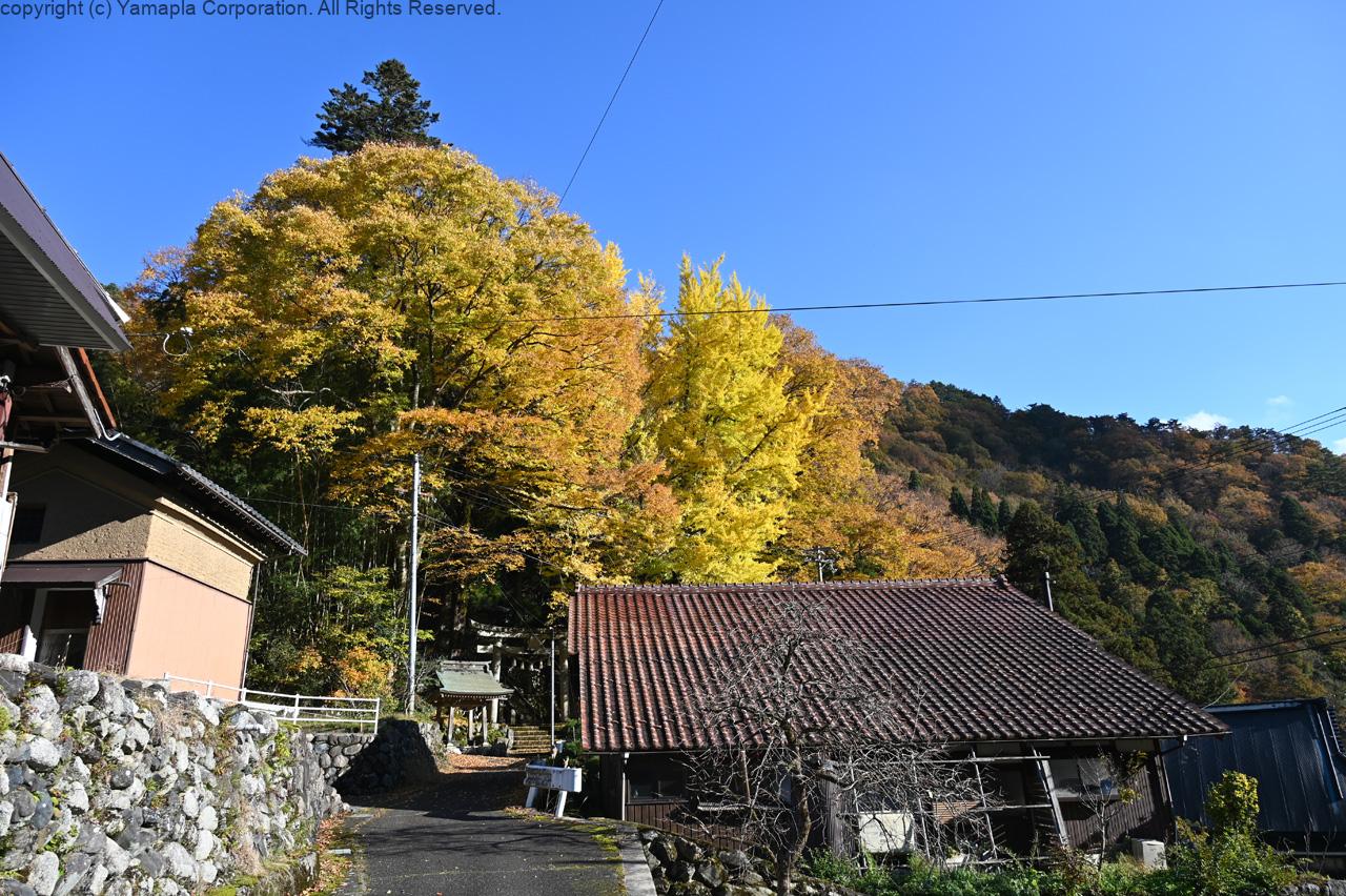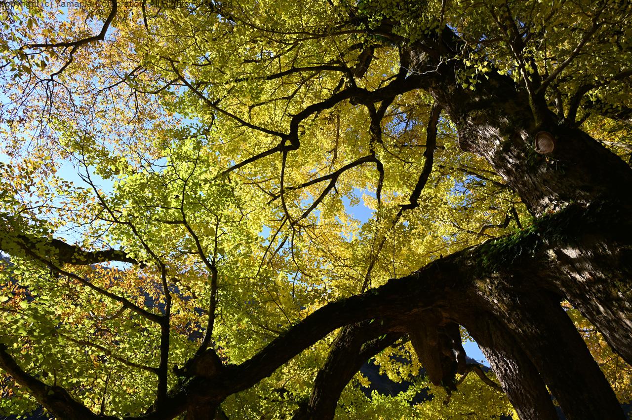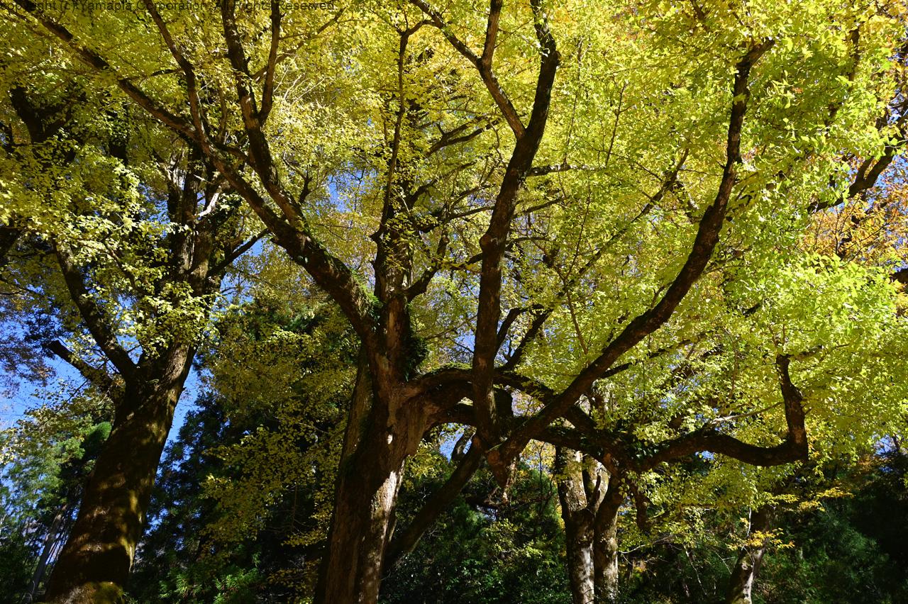 米原市曲谷(まがたに)の白山神社境内にある乳(ちち)イチョウの巨木が鮮やかな黄金色に色づいている。