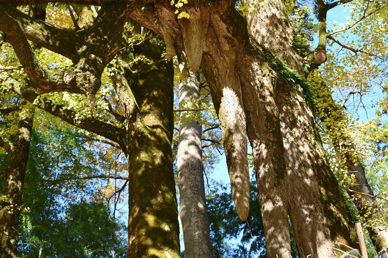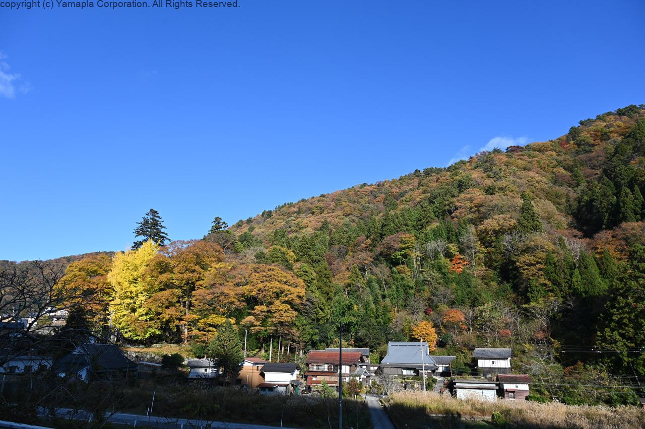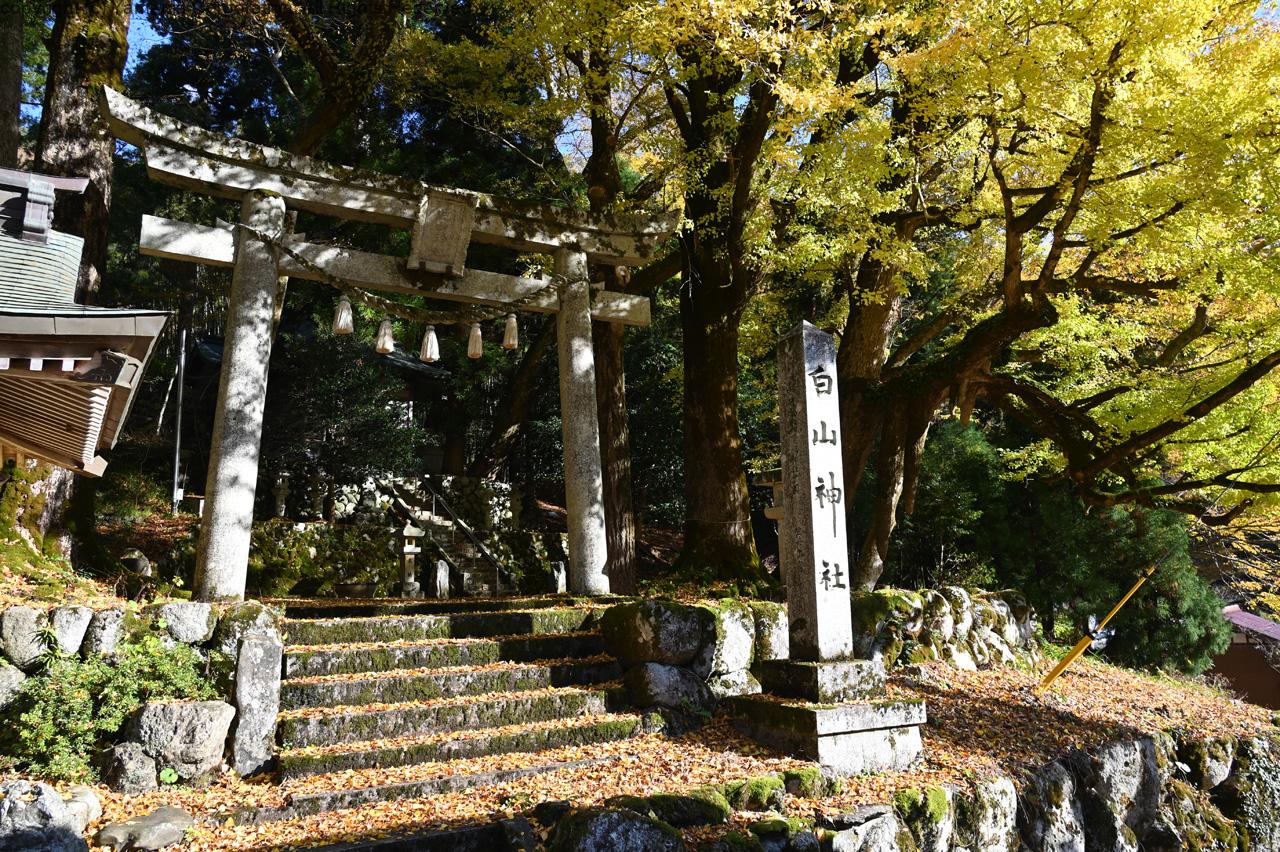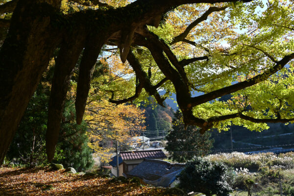 米原市曲谷(まがたに)の白山神社境内にある乳(ちち)イチョウの巨木が鮮やかな黄金色に色づいている。