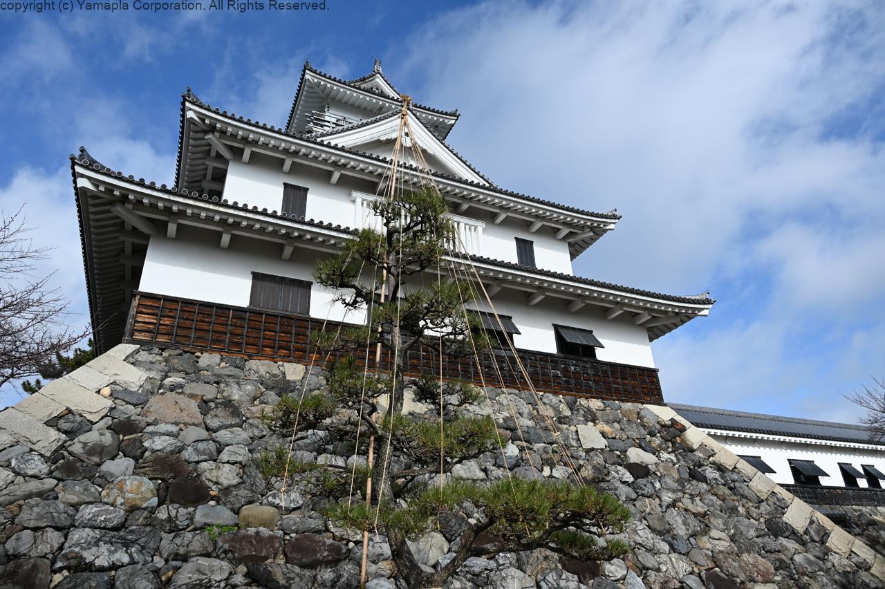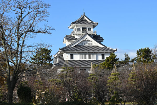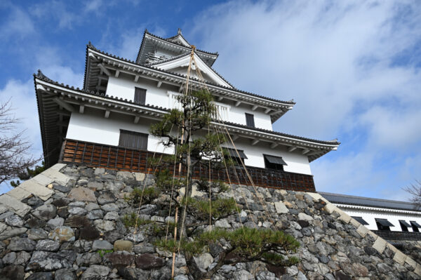 雪の重みから樹木の枝折れを防ぐ「雪つり」。松に竹の柱を立て、先端から放射状に縄を張った姿はこの時期ならではの美しい光景だ。
