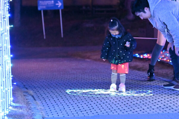 駐車場周辺のガーデンエリアでは、声に反応してきらめく光のアートを楽しむ子供連れの姿があった。エントランスやプールサイドでも展開している。来年3月31日まで。