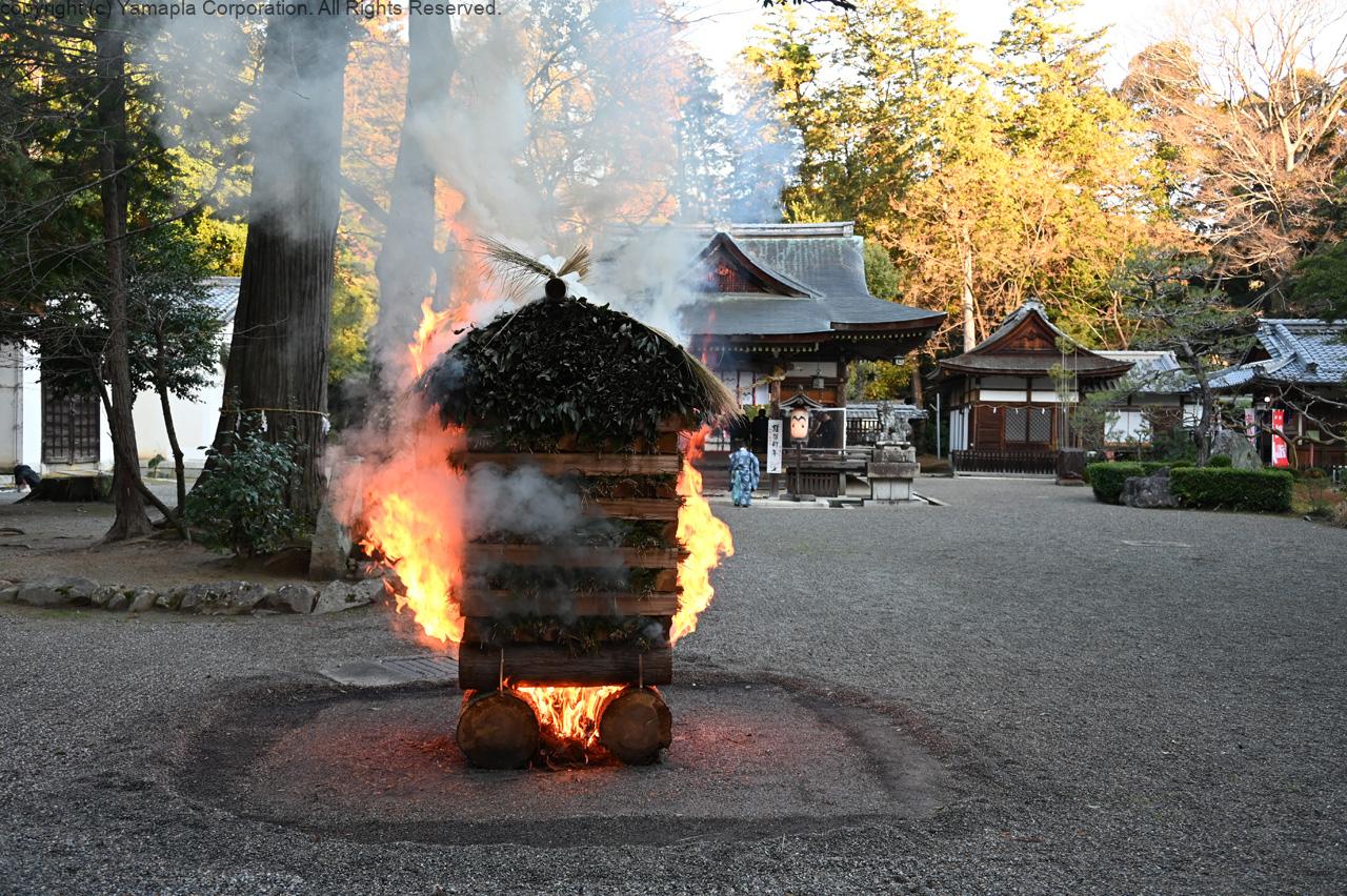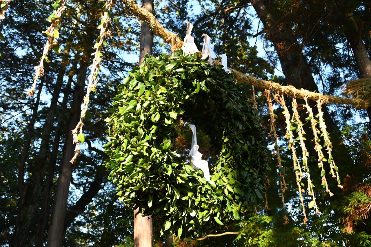 魔除けと五穀豊穣を願って作られた「マジャラコ」※は、年末には参道に1月8日には集落東端の中山道脇に吊るされる。