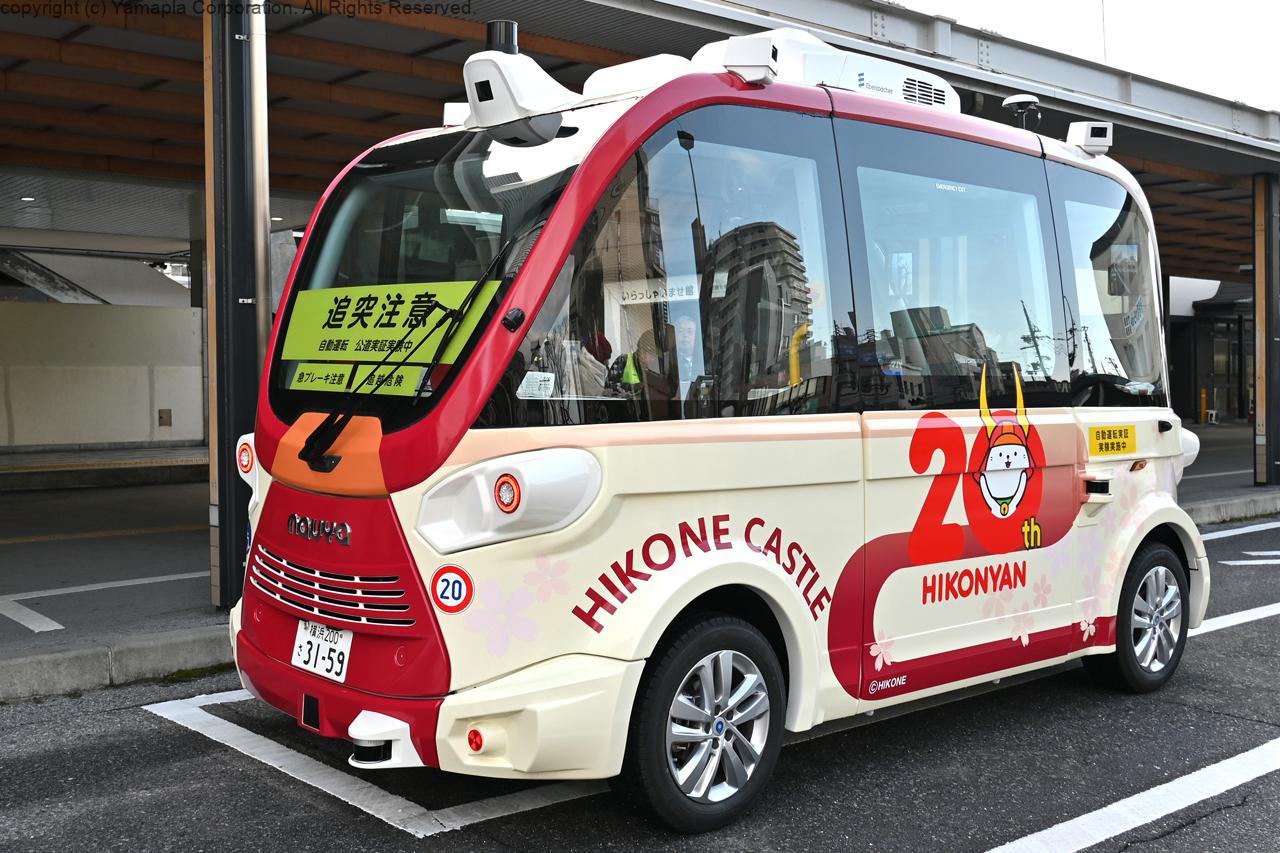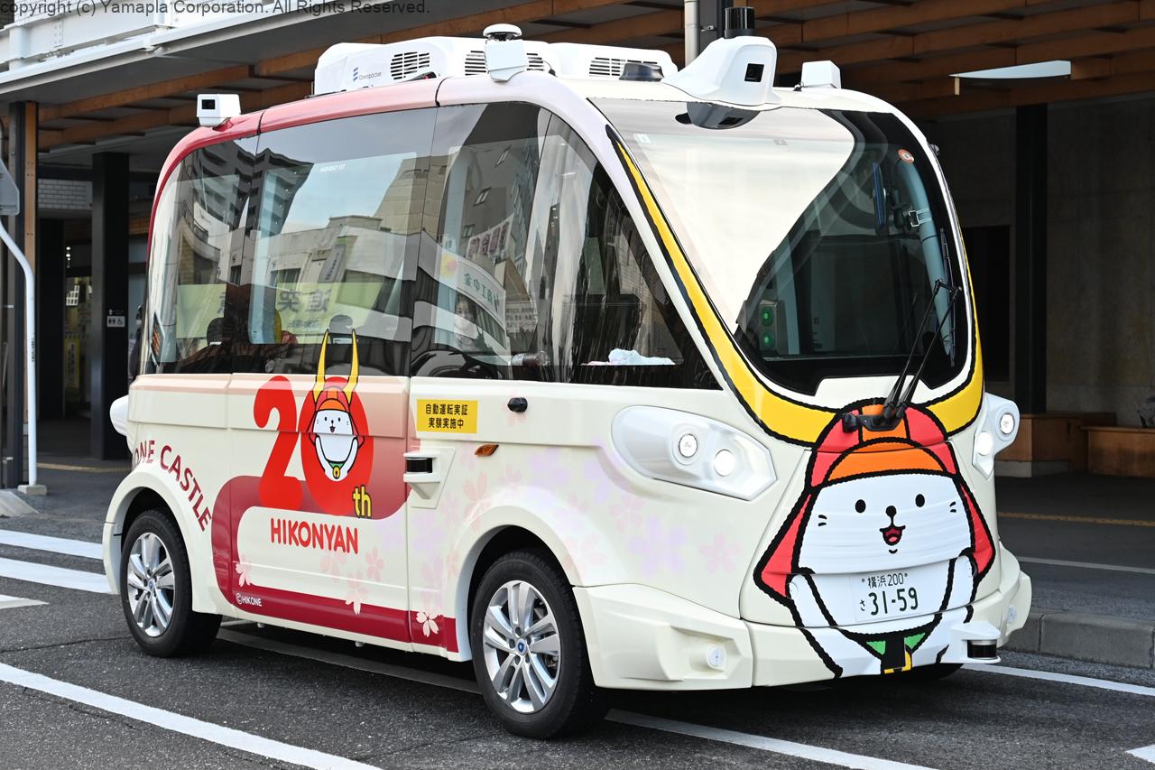 JR彦根駅前と彦根城内「いろは松駐車場」間の往復約1.5キロを時速18キロ未満で走行。滋賀県が県内で初めて実施するもので、車両はフランスのNAVYA(ナビヤ)モビリティーSAS製。車体には彦根市のマスコットキャラクターひこにゃんや彦根城がラッピングされている。