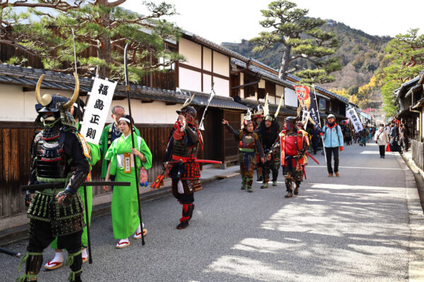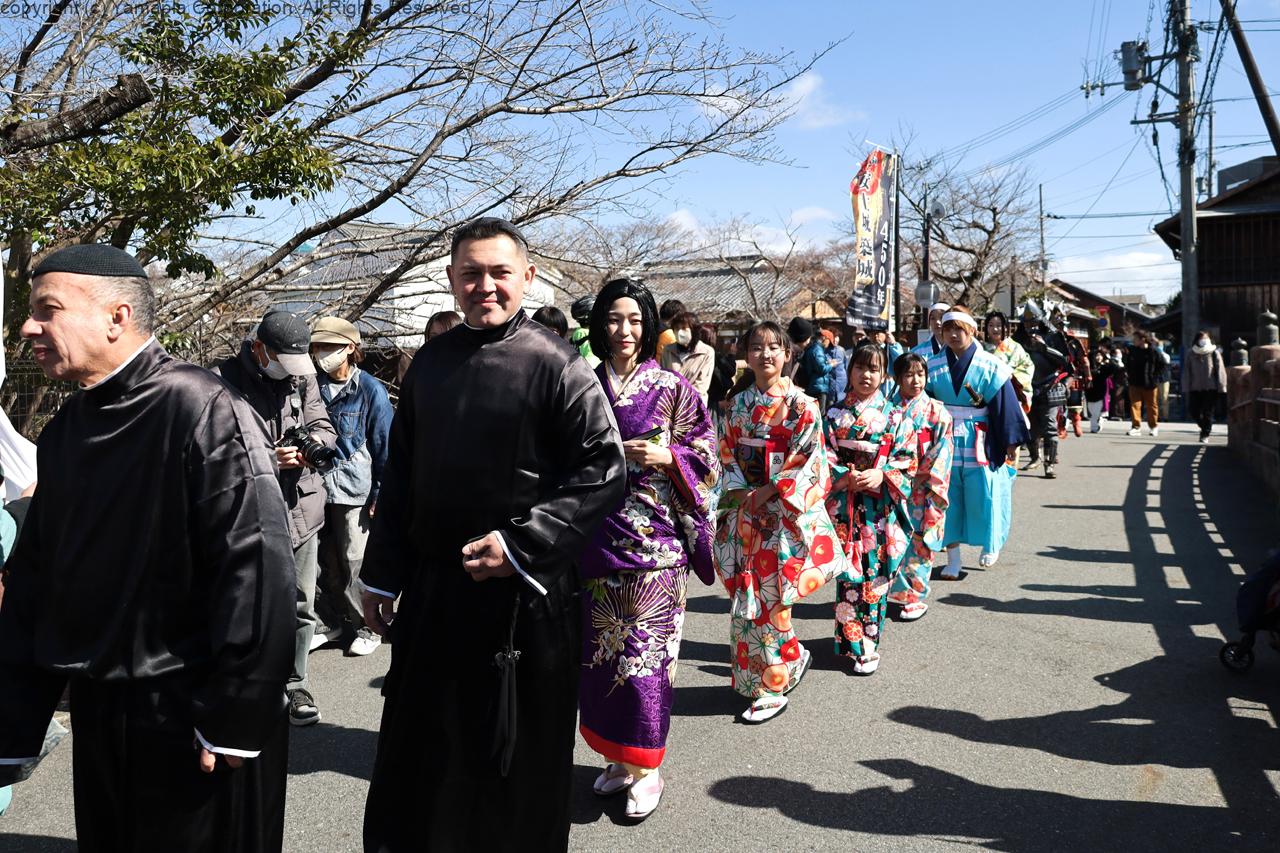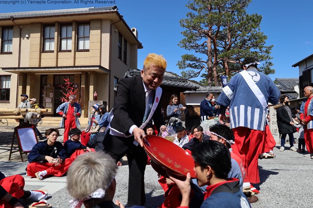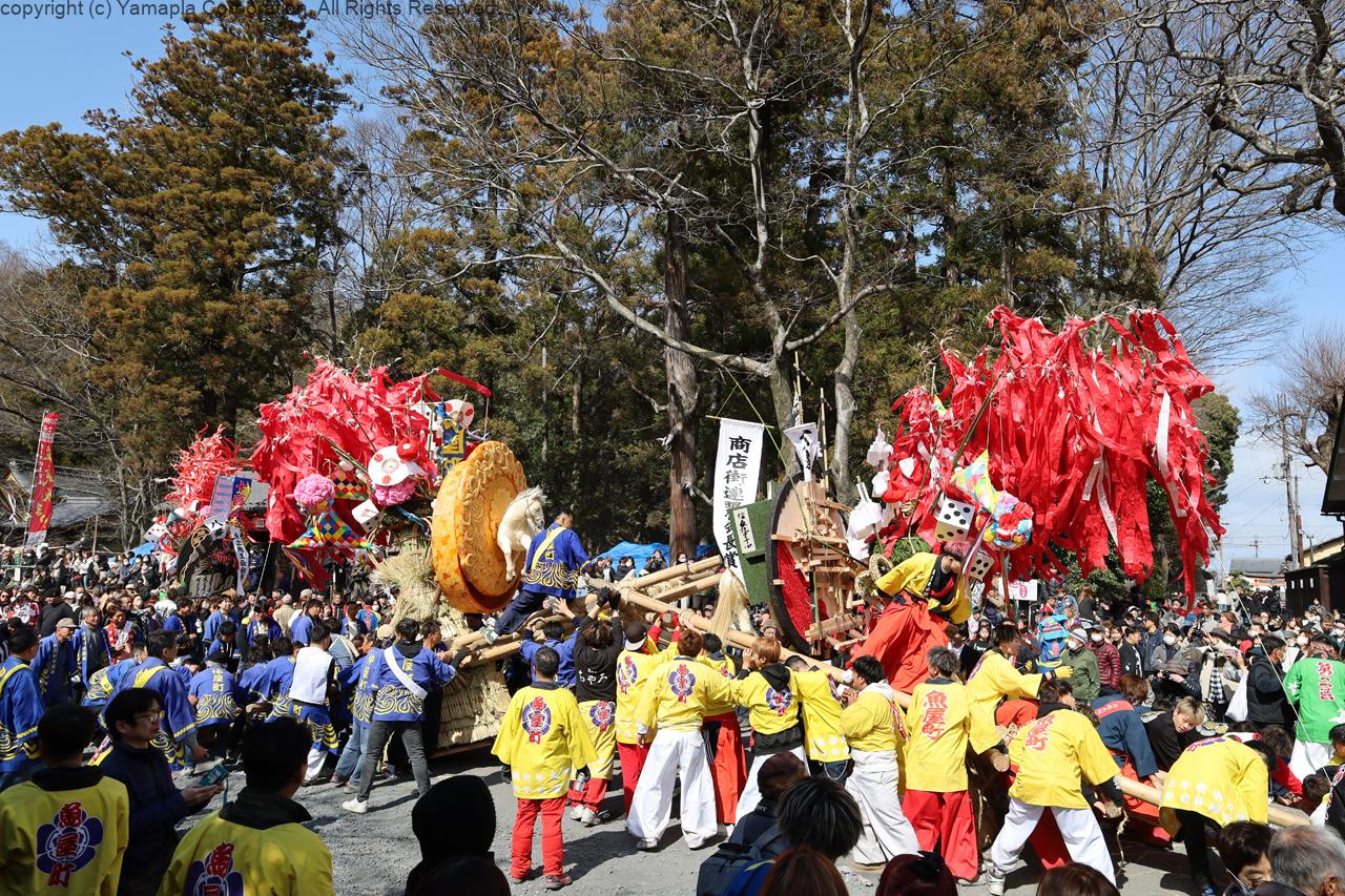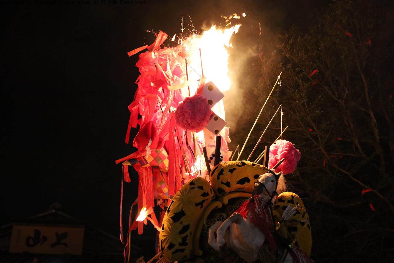 初日は午前中、左義長13基が八幡宮に集合し奉納。午後からは「まっせまっせ」のかけ声と共に氏子地域を練り歩いた。また安土城築城450年を記念して、同市安土町の武将隊約80名が一帯を練り祭りを盛り上げ、夕方には今年の干支「午」をモチーフにしたダシコンクールが行われ、池田町が優勝した。