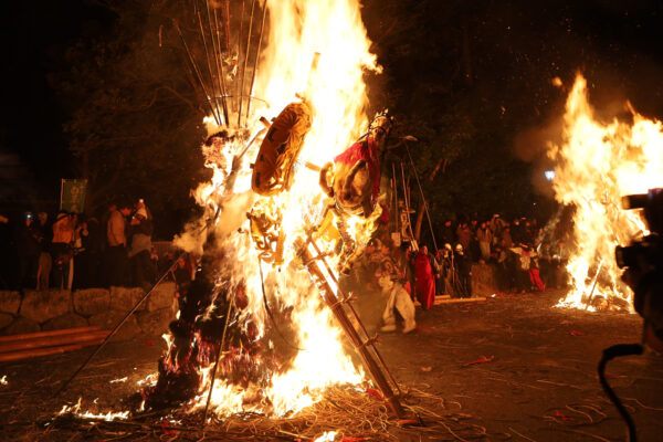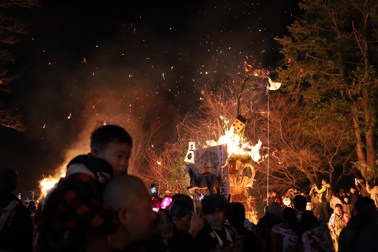 翌日は同神社の馬場で左義長同士がぶつかり合う「組み合わせ」が演じられた。午後8時過ぎ、5基の左義長に一斉奉火。その後次々と左義長が宮入りし、燃やされるたび火柱が上がった。