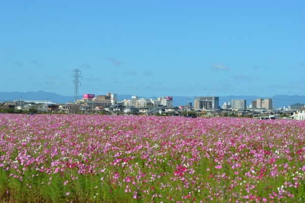 近江八幡市野田町のコスモスが見ごろを迎えている。約3ヘクタールの土地に、約300万本のコスモスが栽培されている。