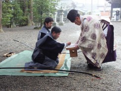 この日は宮司のお祓いの後、二人の当屋(とうや)が紙製の鵠に向けて2回ずつ矢を放った。玉串を奉奠し、社務所で引継ぎと直会(なおらい)が行われ、神事はお開きとなった。