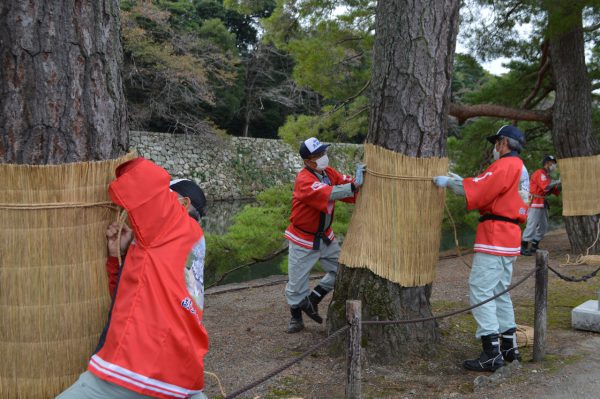 11月6日、彦根城で伝統の「こも巻き」が行われた。こも巻きは、害虫を温かいワラに集めて被害を防ぐ伝統的な駆除法で、冬の風物詩となっている。 彦根城運営管理センターの作業員14名が2人1組となって、わらで作ったこもを手際よく松の木の幹にひもで縛りつけていった。