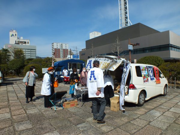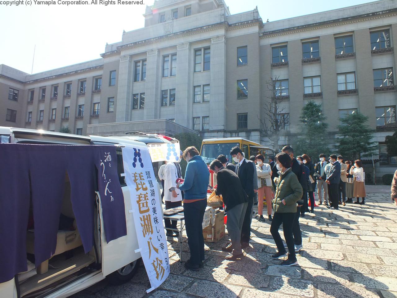 地元の人や県庁の職員などたくさんの人が訪れ、湖魚の料理が入った弁当や秘伝のタレにつけた唐揚げ、近江牛の丼など好みの弁当を購入していた。毎週木曜日開催。3月25日まで