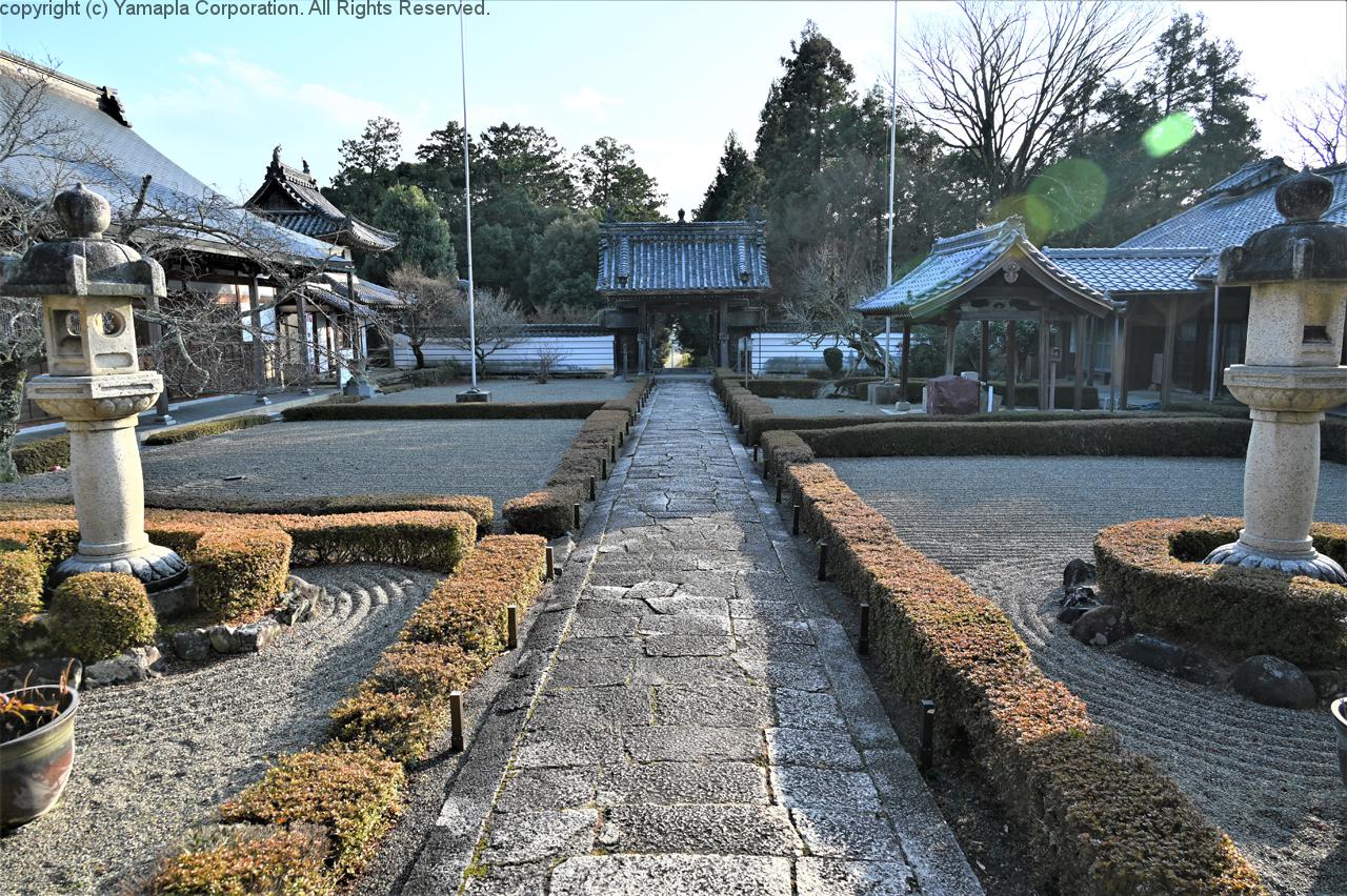戦国時代の戦火により焼失されたが、後水尾上皇の勅願により再建されたという。檜皮葺(ひわだぶき)屋根の本堂は京都御所の清涼殿を移築したもので、正面の唐破風(からはふ)造りの向拝(こうはい)には菊の紋が輝いている。本尊は十一面千手観音菩薩立像(秘仏)で、禅堂の主尊・大日如来像の脇には聖徳太子像が安置されている。