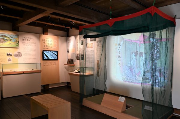 本店敷地内の土蔵の一部を改修した史料館1階展示フロアーには、1566年創業した初代西川仁右衛門から現在まで450年以上にわたる西川の歩みが、映像やパネルなどによって紹介されている。