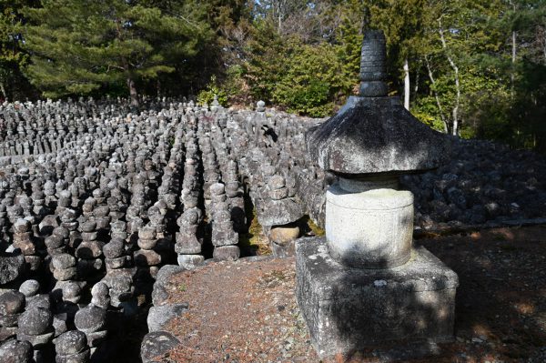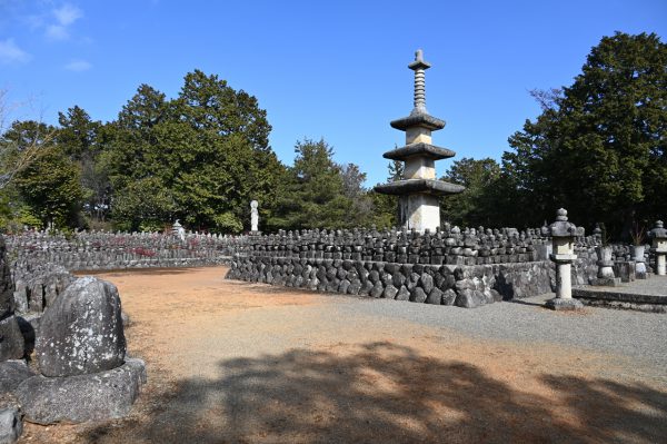 境内には阿育王塔と呼ばれる三重の石塔が、おびただしい数の五輪塔に囲まれてそびえている。