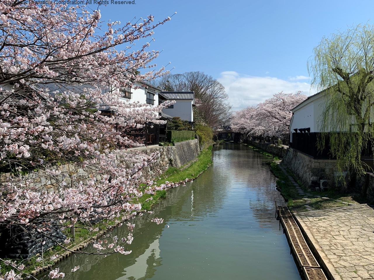 近江八幡市宮内町にある八幡堀の桜が満開を迎え、多くの人が花見に訪れている。 堀を行き交う和船から眺める人や橋の上からカメラを構える人など、それぞれに美しい景色を楽しんでいる。