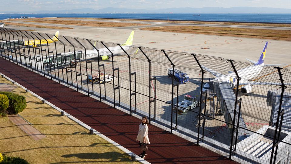 屋上の展望デッキ。瀬戸内海方面の海原をバックに離発着する飛行機が眺められます