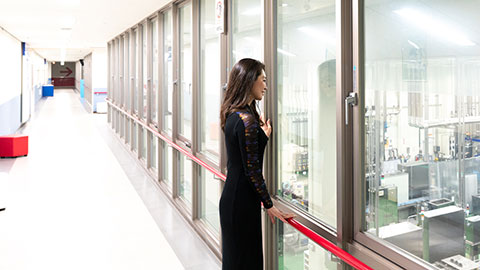 クリーンルームに入る前に衣服などに付着した髪の毛や埃をおとすエアーシャワーを体験