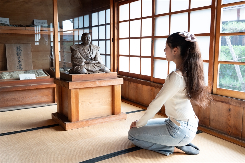 藤樹書院跡は、江戸時代初期に「日本の陽明学の祖」と呼ばれた中江藤樹が、身分や年齢の隔てなく多くの人に教えを説いた学び舎。現在の建物は再建されたものですが、国の史跡に指定され、往時の面影を今に伝えています。素朴ながらも趣のある室内には、藤樹が愛用した文机や言葉を刻んだ額が残り、静かな時間が流れます。隣接する「良知館」には資料や教えがあります。地域の方が温かく迎えてくださるので、歴史に詳しくなくても気軽に立ち寄り、藤樹の思想に触れることができます。