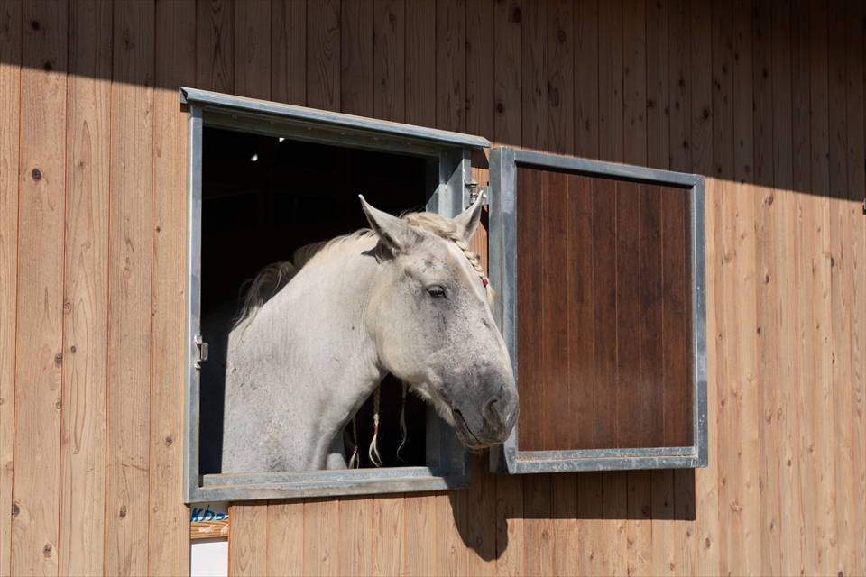厩舎の窓からひょっこり顔をのぞかせているのは「りんご」ちゃん