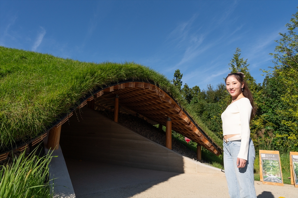 比良山系の山並みに溶け込むような、やわらかな曲線と緑に包まれた建物