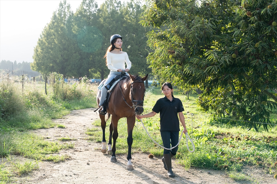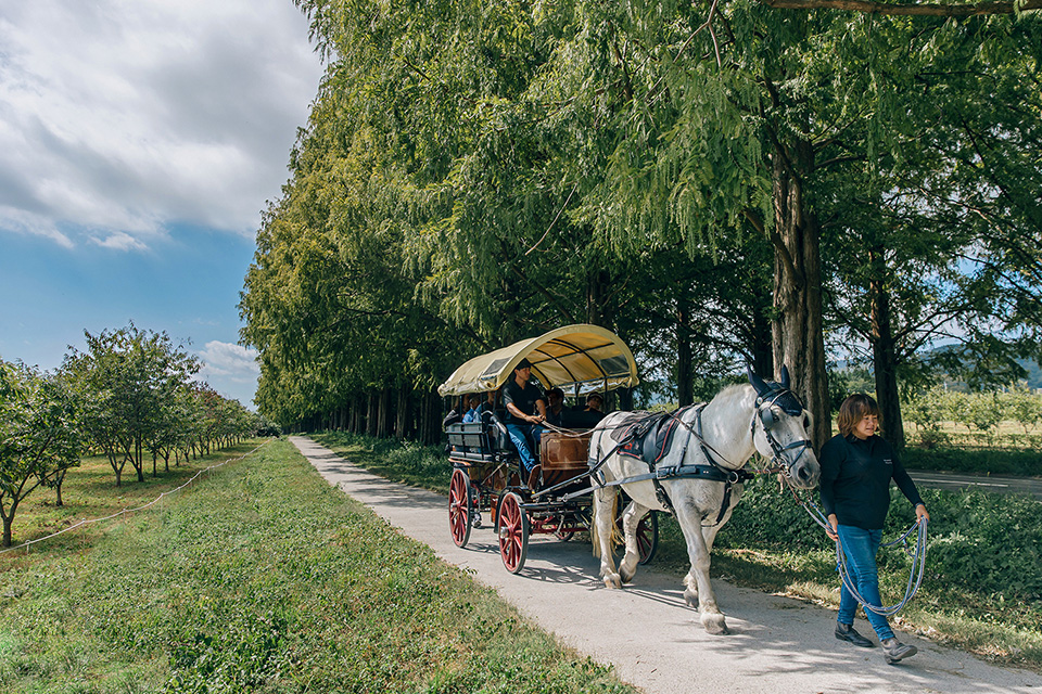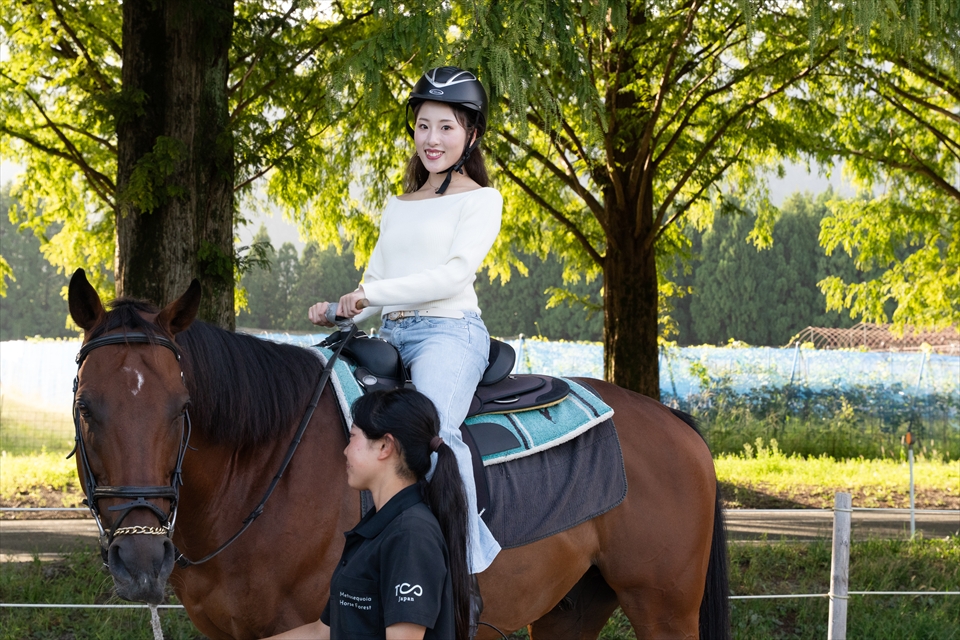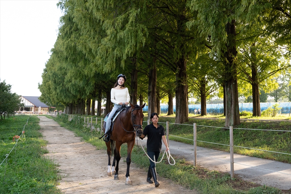 メタセコイア並木を一緒にお散歩できる乗馬体験。馬の背に揺られながら、特別な景色を楽しみます