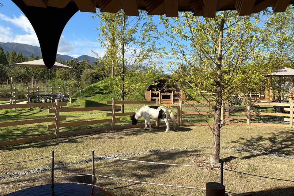 カフェの前の広場では、ミニチュアホースと触れ合えます