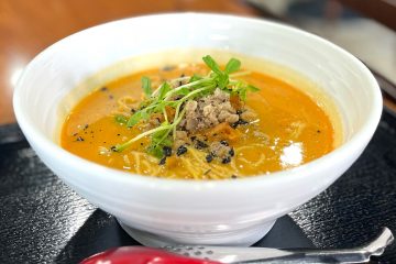 牛・豚・鶏と野菜からとったスープに、ラー油でピリ辛、2種類のゴマでまろやかさを加えている。甘辛い味付けの粗挽き豚ミンチ、ザーサイと白ネギをきざんだもの、豆苗をトッピング。焦がした白ネギをアクセントに散らしている。まろやかな味のスープは最後の一滴まで美味しくいただける。辛さは調節できるので子どもでも食べられる。