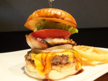 甲賀市の柏屋製パン所のふっくら甘みのある特製バンズに、近江牛100%パティ・無添加ベーコン・チェダーチーズ・目玉焼き・グリルドオニオン・トマト・レタスが挟んでありボリューム満点。溢れる肉汁やベーコンからの旨みが口の中に広がる。サクサクのオニオンリングも付いている。「『慶州』で仕入れた一頭買いの近江牛の美味しい部分を、つなぎを一切使わずパティにしました。自家製ソースに無添加ベーコンと、添加物を使わない安心安全な素材を使っています。高価に思われるかもしれませんが、食べると必ず満足していただける自信があります」と、オーナーの竹村和真(たけむらかずま)さん。ほかに、「スタンダードバーガー」(税込1,210円)、「アボカドチーズバーガー」(税込1,628円)など15種類。テイクアウトも行っている。(オンライン予約または店頭にて受付)
