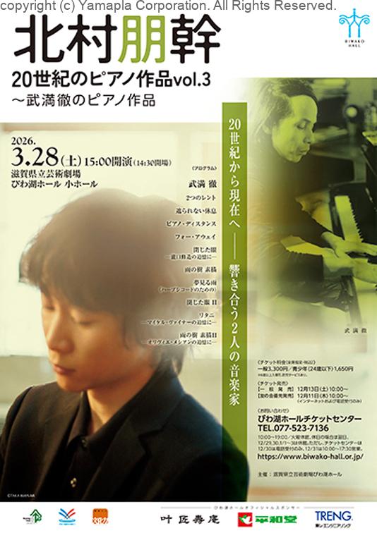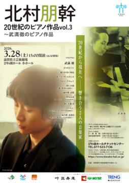 2026年3月28日(土)びわ湖ホール・小ホールで「北村朋幹 20世紀のピアノ作品vol.3 ~武満徹のピアノ作品」が開かれる。