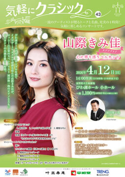 2026年4月12日(日)びわ湖ホール・小ホールで、気軽にクラシック43「山際きみ佳 メゾソプラノ 心に寄りそうベルカント」が開かれる。
