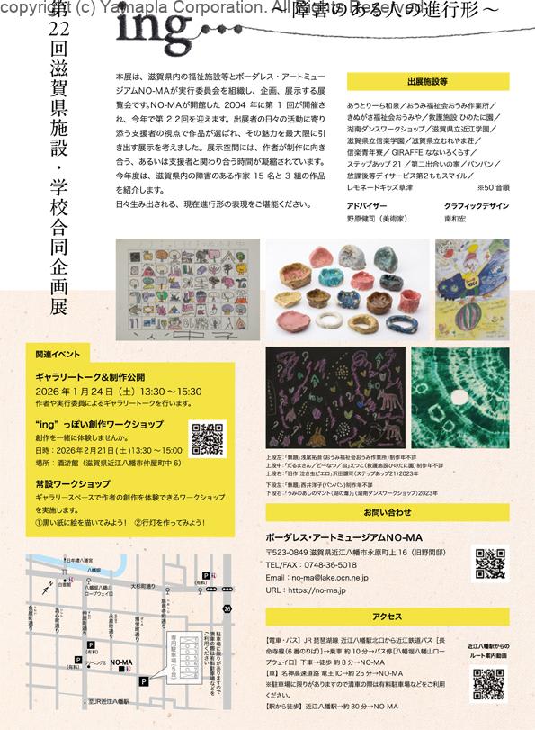 2026年1月24日(土)~3月15日(日)まで、ボーダレス・アートミュージアムNO-MAで「第22回滋賀県施設・学校合同企画展 ing…~障害のある人の進行形~」が開催中。