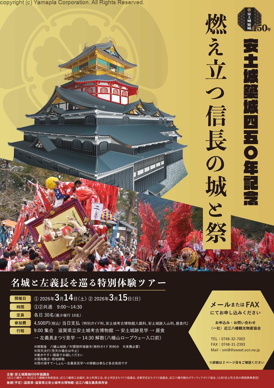 安土城築城450年を記念し、近江八幡市内の日本の名城ツアーを開催。安土城考古博物館や安土城跡を巡った後、当日に行われる左義長まつりを見学できる。