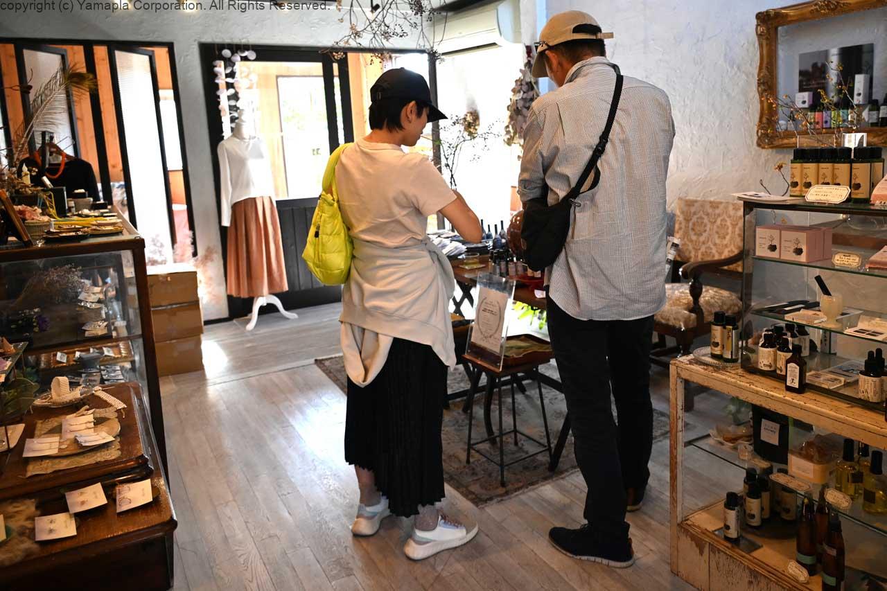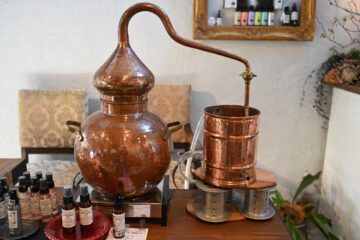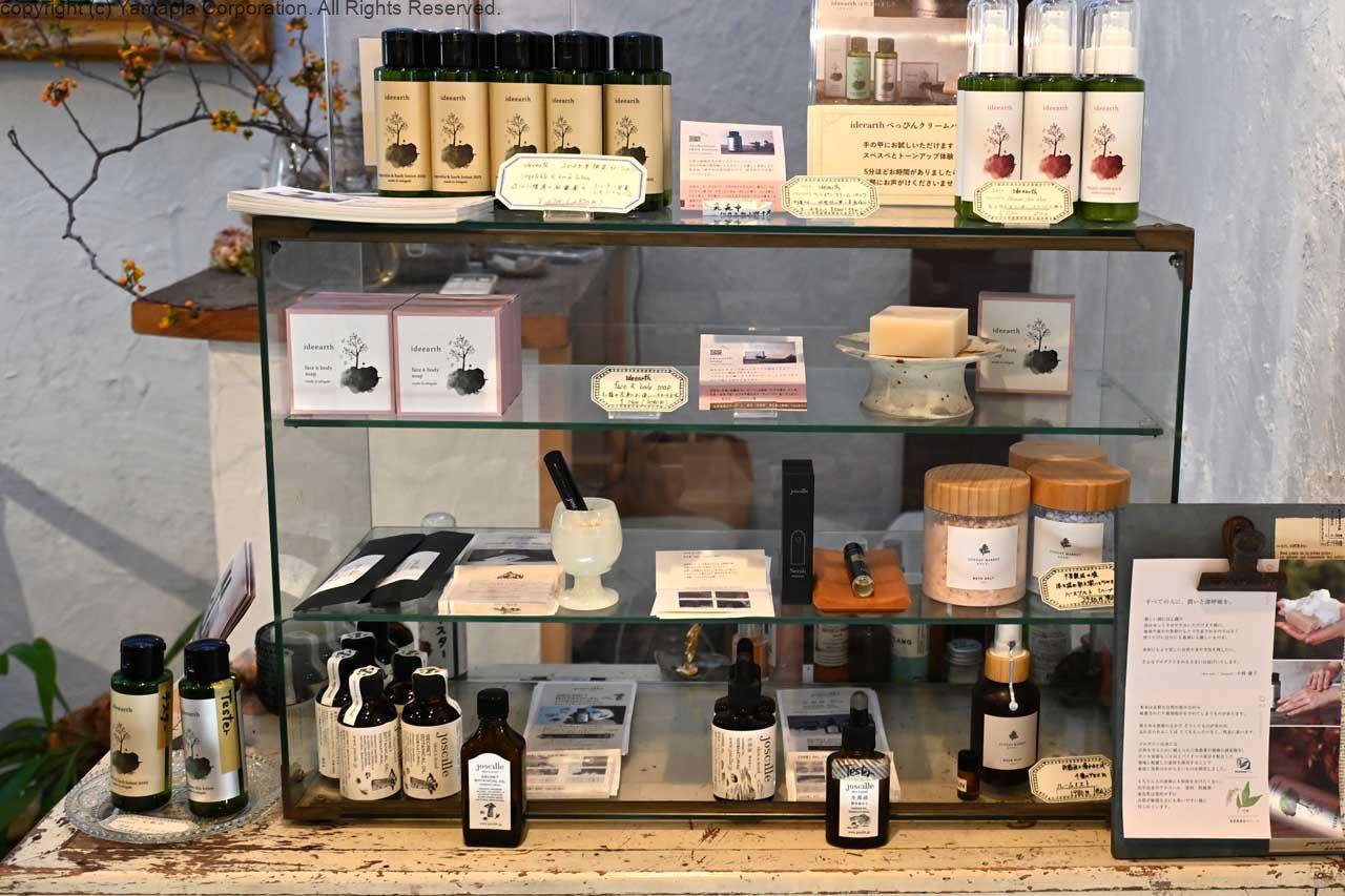 店の入口には銅製の立派な蒸留器が備えられ、オーガニックコスメに対する小林さんの情熱が伝わってくるようだ。蒸留水は市内の契約農家から運ばれた無農薬の野菜、ハーブと酒蔵の湧き水で精製後、石垣島の化粧品製造工場へ送られイデアノートオリジナルのローションが作られる。