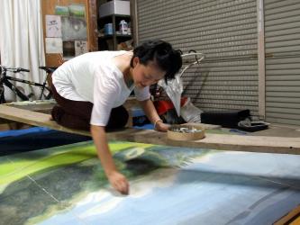 現在は9月18日から近江八幡市で開催される「BIWAKOビエンナーレ2010」に出展する作品づくりに没頭している。今回はヨシ紙をカンバスにした5㍍の大型作品など十数点を出展する予定。イベントに先がけて行ったワークショップでは、子どもたちと一緒に屋形船に絵を描いた。会期中はこの船が八幡堀を運航する。