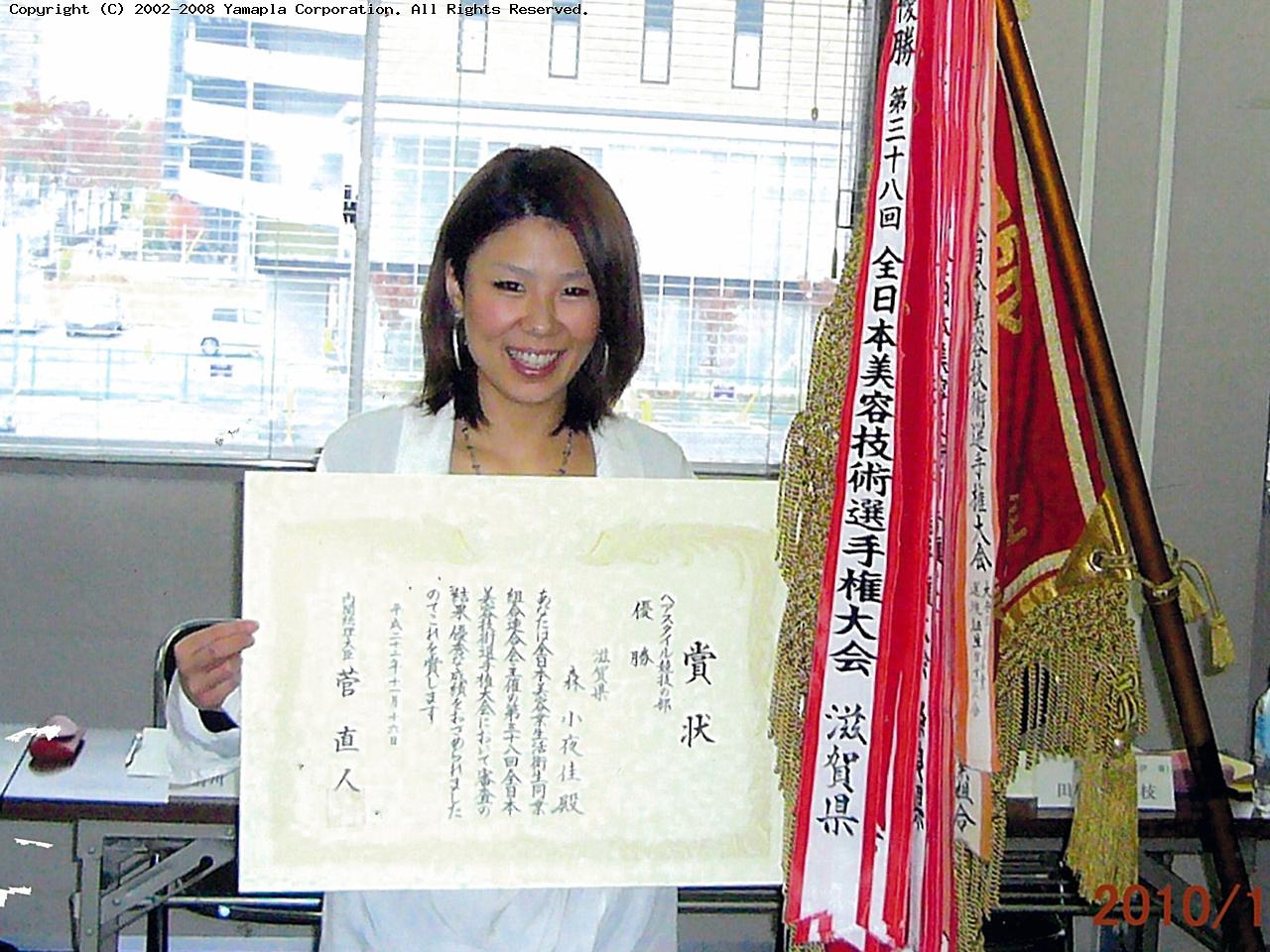 全日本美容技術選手権大会は美容業界最大のイベントで、各都道府県の大会で優勝した人だけが出場できる。カット&ブロー、花嫁化粧着付け、ヘアスタイルなど八つの競技部門に分かれている。森さんが出場したのはヘアスタイル競技の部。事前に染めてカットした髪を20分の制限時間でセットする。森さんの作品は「花」をイメージした。ドライヤーやスプレー、ブラシ、コーム(くし)を使って形を整えていく。ブローで髪の流れを方向付け、根元に逆毛を立てて土台を作る。髪の色はでき上がったときの髪の流れや形を計算して染めた。全体のバランスのよさと、華やかさ、力強さが評価され、300点満点で299点を獲得。2位以下を大きく引き離す成績で、滋賀県初の優勝を果たした。